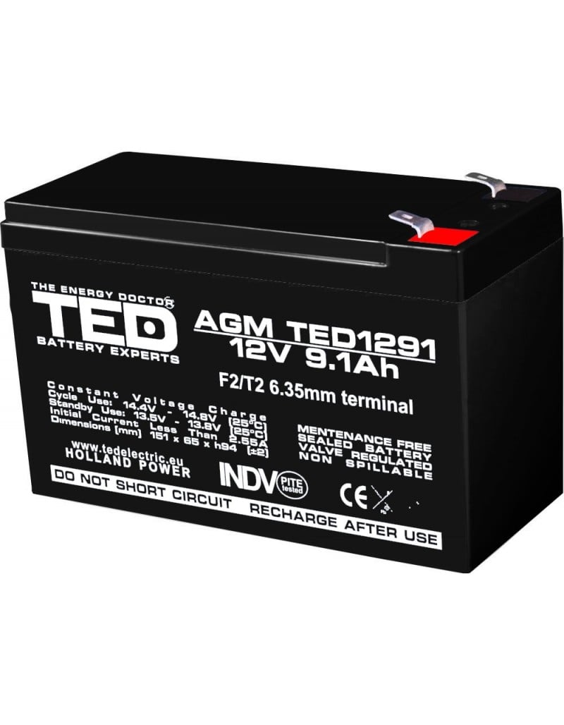 Acumulatori acestia se folosesc doar pentru sisteme de securitate! Daca sunt folositi pentru alt fel de sistem decat cel specificat poate duce la anularea garantiei.Tensiune: 12VCapacitate: 9,1 AhDimensiuniLungime: 151 mmLățime: 65 mm Înălțime: 94 mmÎnălțime totală (cu terminale): 100 mmGreutate: 2.5 kgCaracteristici TehniceTensiunea in modul "standby" (25 °C): 13.6-13.8VTensiunea de incarcare ciclica (25 °C): 14.5-14.9VCurent maxim initial de incarcare 2.7 ARezistența internă (acumulator complet încărcat (la 25 °C): 20 mOhmInfluența temperaturii asupra capacității acumulatorului: la +40 °C: aproximativ 102 % la +25 °C: aproximativ 100% la 0 °C: aproximativ 85%la -15 °C: aproximativ 62%Descărcare automată (la 25 ° C): capacitate dupa 3 luni de depozitare- 91% capacitate după 6 luni de depozitare- 82% capacitate dupa 9 luni de depozitare- 64%Borna F2 (borna ingusta, latime 6.35mm)Adaptor terminal acumulatori Adaptor F2-F1