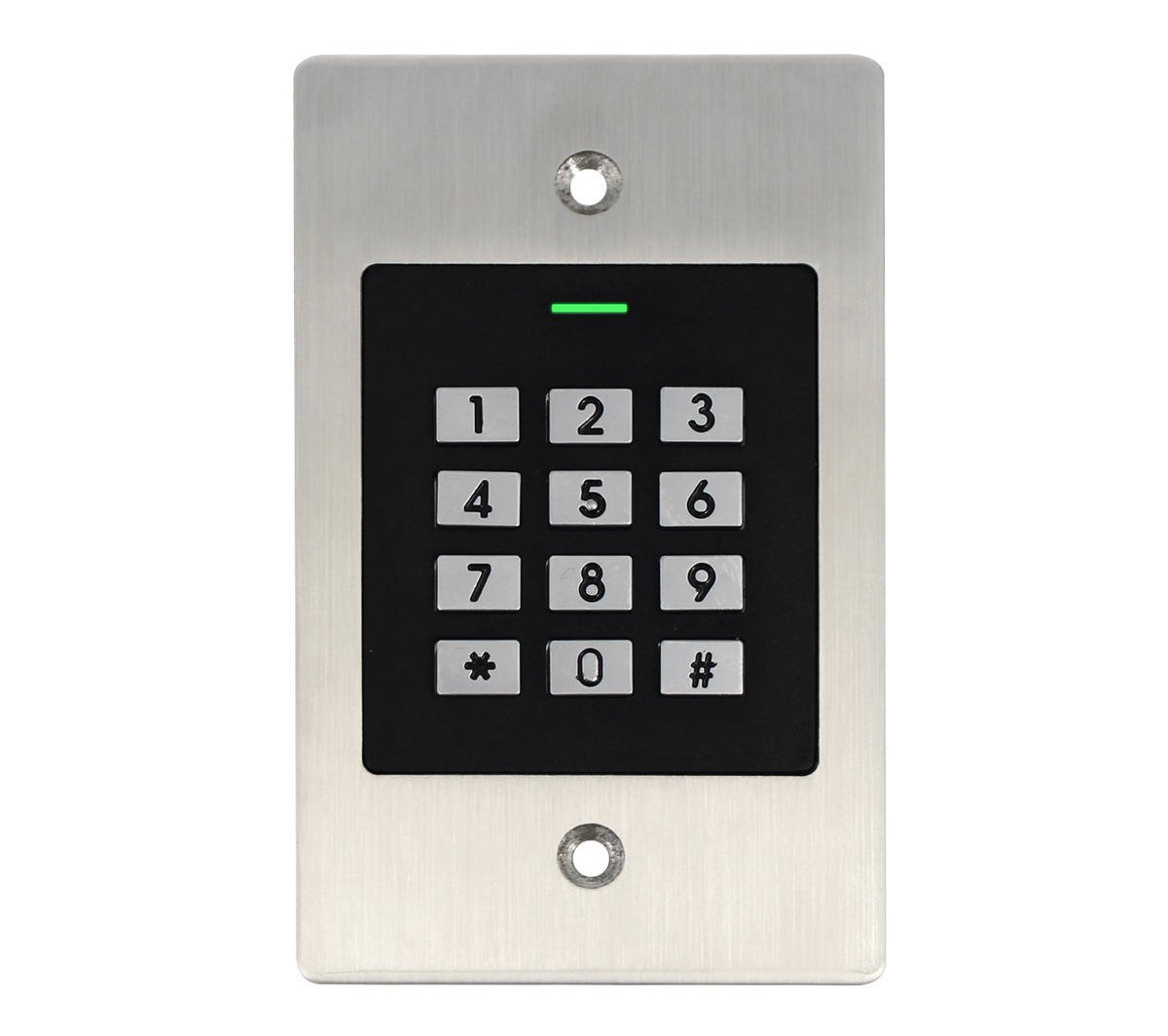 Controlul acces SECUKEY-EK2 suporta pana la 1000 de utilizatori, dintre care 990 sunt utilizatori normali, iar 10 sunt utilizatori vizitatori. Cardurile suportate au frecventa de 125KHz si pot fi utilizate intr-un domeniu de citire de la 0 pana la 6 cm.Ofera trei moduri de acces: card, cod PIN si card + cod PIN.De asemenea, sistemul dispune de un releu, cu capacitate maxima de 2A, ce poate gestiona majoritatea incuietorilor electronice, iar timpul de deschidere al releului este ajustabil.Acesta poate fi amplasat inclusiv in medii exterioare datorita certificarii IP66, care il protejeaza impotriva intemperiilor. Cu un design compact, acesta se integreaza perfect intr-o gama larga de locatii.Dimensiunile compacte de 115x70x25mm si greutatea redusa de 245g il fac usor de instalat si manipulat. Carcasa din otel inoxidabil este disponibila in culori argintie si neagra, asigurand o estetica eleganta.