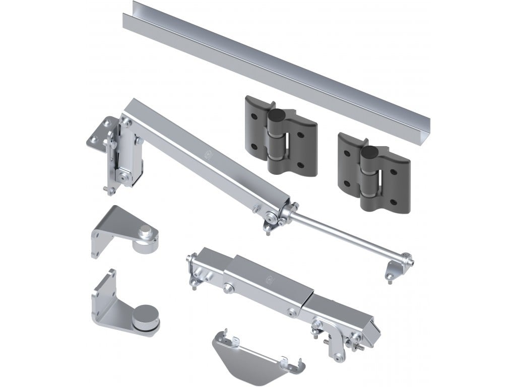 Feronerie poarta armonica bifold 2x2,5 metri Sistem Fac SRL Italia ,Portile articulate sunt  destinate spatiilor de acces mici – inguste, Bifolding este solutia ideala.Limite de dimensiuni constructive:  1.9m min- 5m max, 95kg/semifoaieKit-ul contine urmatoare componente:2buc Balama dublă din aluminiu ,articulatie intre semifoi.2buc Balama inferioara si superioara pe rulment 50mm1buc  Mecanism de pliere intre stalp si canat poarta.1buc  Mecanism de pliere mijloc intre foi mobile