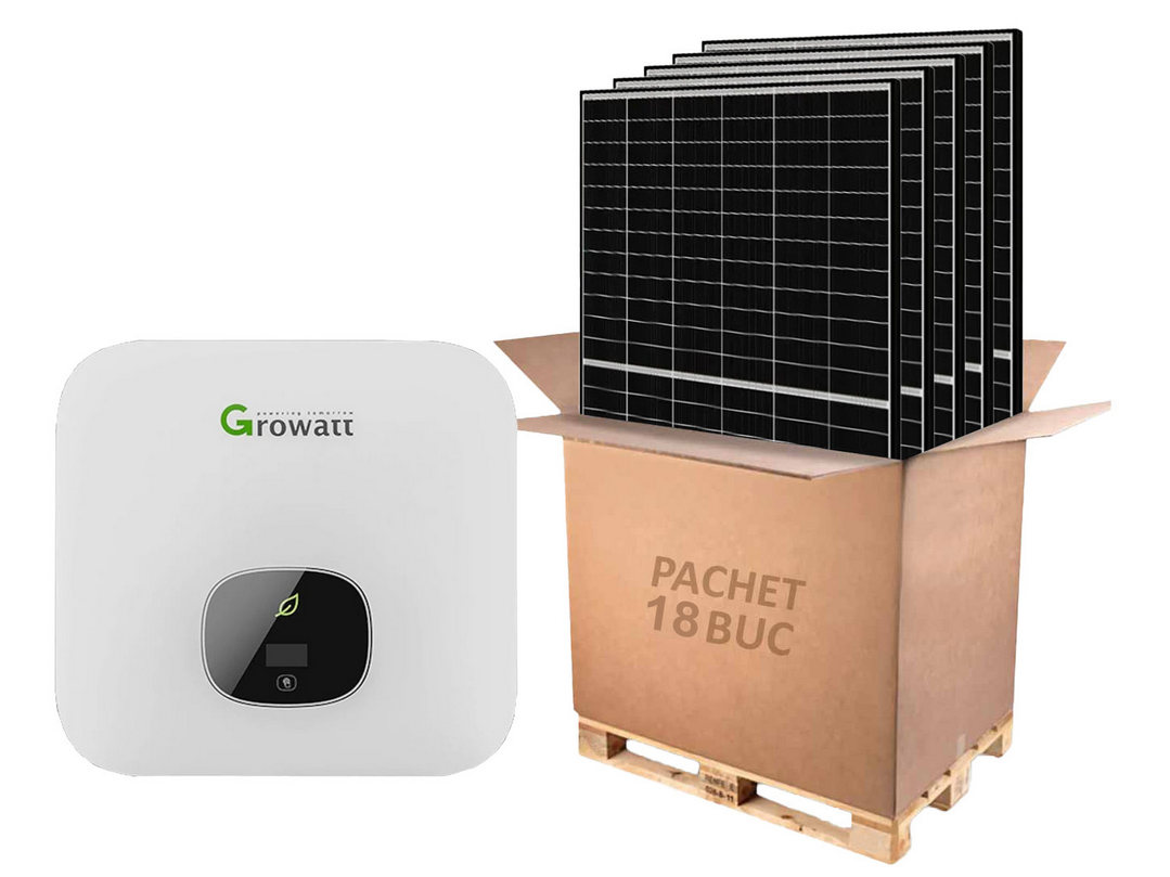 .pHighlight { display: block; background-color: #ffeff0; color: black; font-weight: bold; box-sizing: border-box; border-radius: 5px; padding: 5px;Conform legii 216 din 10 iulie 2023 persoanele JURIDICE pot achizitiona produse fotovoltaice cu TVA 9% daca revand aceste produse la persoane fizice, dupa ce completeaza o declaratie pe propria raspundere. Declaratia pentru persoane jurdice o gasiti AICI.Persoanele FIZICE care achizitioneaza panouri pentru alte destinatii decat locuinta trebuie sa completeze o declaratie pe propria raspundere, pe care o gasiti AICI.Kit-ul este compus din: 1x Invertor MOD8000TL3-XH18x Panouri fotovoltaice CS6.2-48TD-455-BFAtentie! Pentru a beneficia de garantia extinsa trebuie sa pastrati factura si certificatul de garantie emis de catre producator.InvertorInvertor pentru sistem fotovoltaic, trifazat, 8KW, ONN GRID / OFF GRID, GROWATT, MOD8000TL3-XHGrowatt a fost fondata in 2010 si este un lider mondial al solutiilor de energie inteligente si este, de asemenea, unul dintre primii 3 furnizori de invertoare fotovoltaice pentru energie solara cu generatie distribuita din 2018. Se afla printre primii 10 furnizori de invertoare fotovoltaice la nivel mondial. GROWATT furnizeaza invertoare fotovoltaice rezidentiale, comerciale si utilitare, sisteme de stocare a energiei, microretele si solutii inteligente de management al energiei.CaracteristiciPregatit pentru baterieTrackere duble MPP.SPD de tip II pe partea DC si AC.Monitorizarea autoconsumului 24 de ore.Totodata trebuie instalat doar de persoanele autorizate.Panou fotovoltaicExperimentati excelenta in performanta si durabilitate cu panoul solar Canadian Solar CS6.2-48TD-455-BF. Creat de un producator de renume mondial, acest modul monofacial integreaza celule de tip N, cunoscute pentru eficienta lor ridicata de conversie de 22,8%, asigurandu-va ca beneficiati de energia solara la capacitate maxima. Cu un numar impresionant de 144 de celule si tehnologie avansata TOPCon, acesta este ideal pentru cei care doresc sa optimizeze productia de energie si sa reduca amprenta de carbon.Conceput pentru a rezista conditiilor meteorologice nefavorabile, panoul ofera o rezistenta remarcabila la zapada de pana la 6000 Pa si la vant de pana la 4000 Pa. Designul sau robust cu sticla-sticla asigura eficienta si durabilitate pe termen lung, sprijinite de o garantie de produs de 25 de ani si o garantie de performanta de 87,4% pentru 30 de ani.Cu dimensiunile sale de 113,40 cm latime si 176,20 cm inaltime, si o greutate de 24,60 kg, panoul se integreaza armonios pe orice amplasament. Cutele sale de culoare neagra si baza alba nu doar ca imbunatatesc estetica, dar si contribuie la functionalitatea generala. Proiectat pentru o tensiune maxima a sistemului de 1500 V, este compatibil cu multiple tipuri de conectori precum T6, MC4-EVO2 si MC4-EVO2A, oferind flexibilitate in instalare.Selectati Canadian Solar CS6.2-48TD-455-BF pentru a beneficia de un produs de top in domeniul energiei regenerabile, care combina fiabilitatea si performanta cu un design sofisticat si durabilitate exceptionala. Perfect adaptat nevoilor unei societati moderne si preocupate de mediul inconjurator, acest panou este alegerea ideala pentru investitorii in energie solara.Acest produs este agabaritic si se livreaza pe un palet special, de aceea se percepe o taxa speciala de transport. Costul transportului este de fix 300 lei. Livrarea se face pe palet profesional, oriunde in Romania.Panourile sunt predate curierului Gebrüder Weiss in maxim 24 de ore. Livrarea se face in functie de disponibilitatea transportatorului, in 3-5 zile. Acest curier NU ACCEPTA Plata la livrare. Puteti plati doar cu cardul sau prin banca. Daca nu acceptati marfa, se retine taxa de transport (300 Lei)