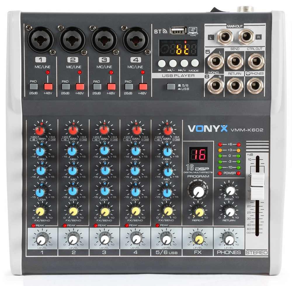 Mixer analog pasiv, 6 canale, Bluetooth, USB, XLR, alimentare Phantom, Vonyx VMM-K602. Fiabilitate si performanță