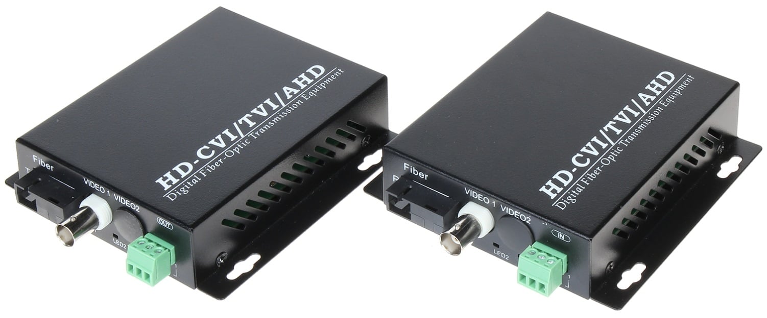 Set transmisie 1 canal video AHD/CVI/TVI pe fibra optica 20KM - 1080P. Compatibil cu toate standardele AHD/CVI/TVI.permite transmiterea canalelor video şi a canalului de date telemetrice RS-485 printr-o singură fibră optică singlemode, la distanţe de până la 20 km. Echipamentul este prevăzut cu o conexiune SC care asigură independenţa transmisiilor.Colaborează cu standardele video AHD, HD-CVI, HD-TVI, PAL şi asigură transmiterea unei imagini de bună calitate, în timp real, la distanţe de până la 20 km, adică mult mai mult decât oferă mijloacele de transmitere standard. Setul de transmiţător şi receptor asigură calitatea optimă a imaginii şi posibilitatea de transmisie RS-485 de la receptor la transmiţător, permiţând comandarea camerelor PTZ.