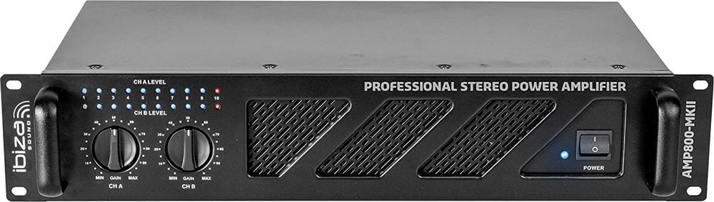 Statia cu Amplificator Profesional 2x600W, Rackabil, Ibiza Sound AMP800-MKII face parte din seria economica si dispune de manere pentru a fi usor montat pe rack.De asemenea, acest produs dispune de o impedanta de la 4 la 8 ohm, dar si de un VU-metru cu LED, menit sa arate nivelul principal al iesirii. O alta functie importanta este reprezentata de optiunea Gain Control ce permite o atenuare a nivelului semnalului de intrare si a volumului de iesire al dispozitivului.Totodata, amplificatorul ofera o racire permanenta, fiind dotat cu un ventilator. In acest mod, este asigurata si o protectie impotriva suprasarcinii / scurtcircuitelor.