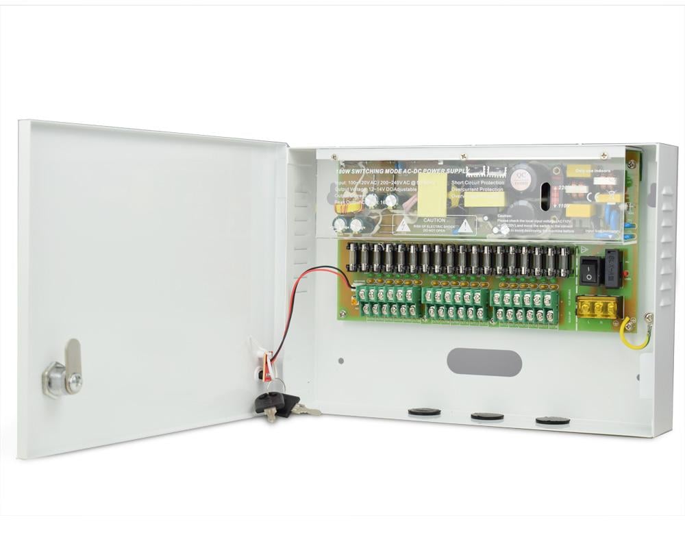 Sursa alimentare 12V-15A cu 18 iesiri protejate ZTS1215-18F, Sursa de alimentare in comutatie cu cutie metalica cu LED/fiecare canal, pentru camere videoTensiune intrare AC 90-260V, 50~60HZTensiune iesire DC 12-14V(ajustabila)Curent de iesire 18 X 0.8 A, total 15AProtectie scurt circuit, supraincarcare, varf de tensiuneDimensiuni cutieLungime 28.3 cmLatime 19,7 cmAdancime 5,2cm ATENTIE! Sursele vin cu un comutator inclus pentru trecerea de la 110V la 220V. Va rugam verificati pozitia comutatorului de fiecare data cand alimentati sursa la curent.