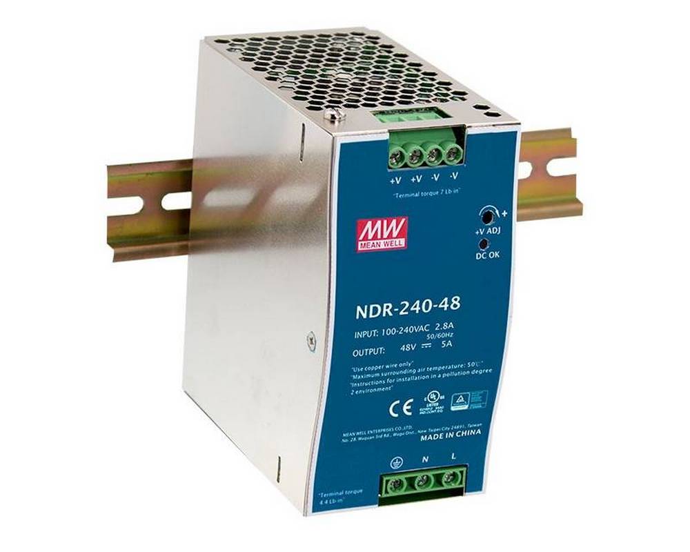 Sursa de alimentare 48V 5A, eficienta 90%, montaj pe sina DIN, Mean Well NDR-240-48. Fiabilitate si performanță
