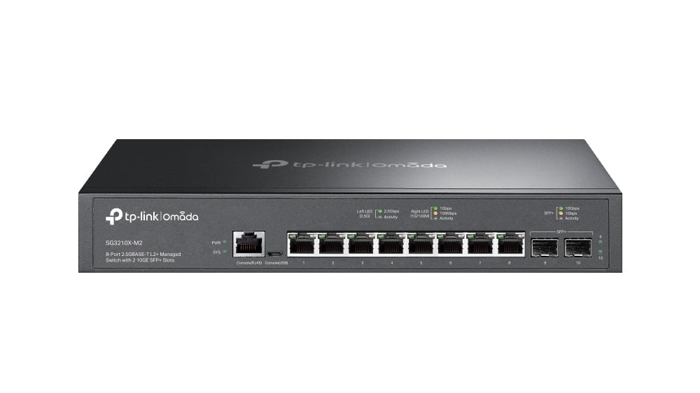 Switch TP-Link Omada, 8 x Porturi 2.5 Gbps, 2 x Sloturi SFP+ 10 Gbps, 80 Gbps, SDN Cloud, SG3210X-M2. Fiabilitate si performanță